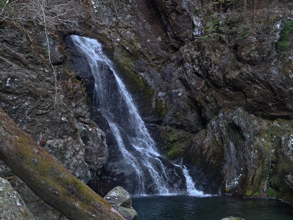 ゴルジュ最上部には落差およそ7メートルほどの滝があり、そこから約30メートルにわたって屈曲した水路が続き、その先に下段のホラ貝の滝が現れます。ごく短い区間ではありますが、水の力だけで削り出されたこの造形を目の当たりにすると、ホラ貝の滝が長い時間をかけて信仰の対象として扱われてきた理由が、少しだけ実感として伝わってくる気がします。