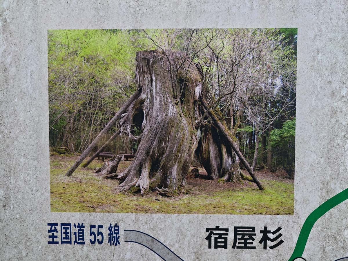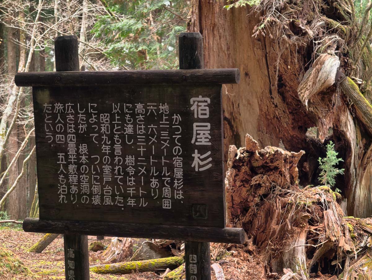 かつての宿屋杉は、地上一.三メートルで周囲一六.六メートルあり、高さは三十二メートルにも達し、樹令は千年とも言われていた。昭和九年の室戸台風によって、ついに倒壊したが、根元の空洞の広さは四畳半敷程あり、旅人の四、五人も泊れたという。