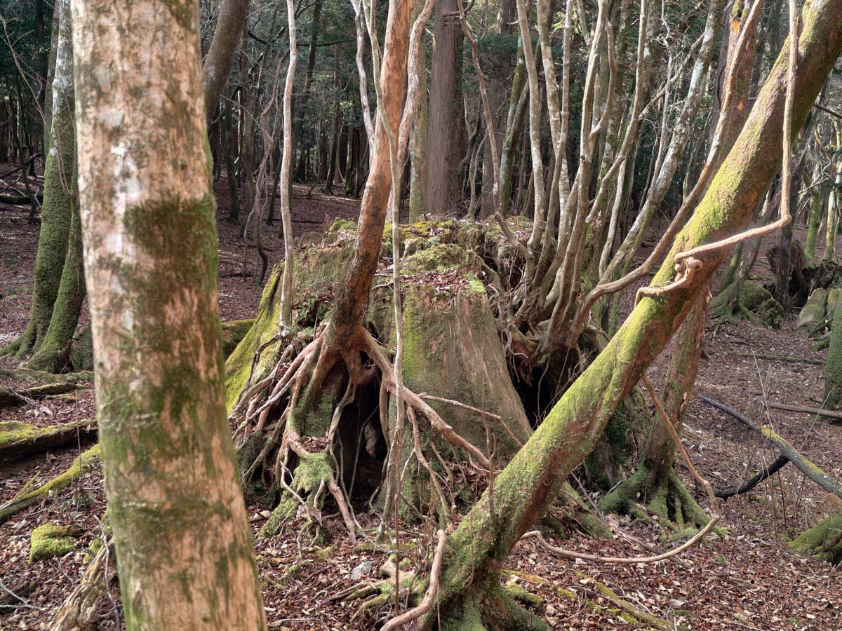 宿屋杉そのものは、すでに朽ち果てつつある倒木の根元に過ぎませんが、ぜひ注目したいのは周囲の環境です。そもそも宿屋杉のような巨木が育つことができたこの山域には、同様の環境条件のもと、多くの杉の巨木が存在してきました。宿屋杉周辺では、伐採や倒壊によって失われたものも目立ちますが、少し東側へ進むと、現在でもなお巨木が残るエリアが点在しています。