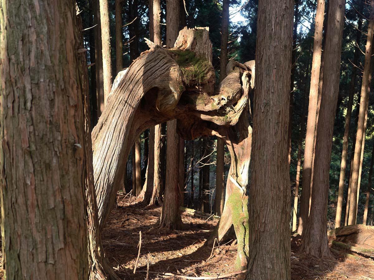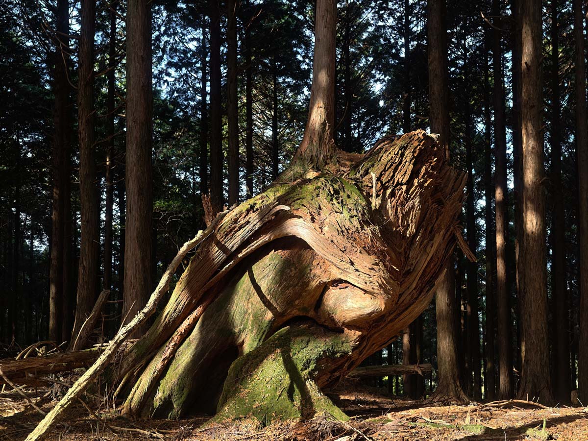 しかし、宿屋杉は昭和9年(1934年)の室戸台風によって倒壊しました。現在残っているのは、その根元部分のみです。倒壊後もしばらくの間は、根元の空洞が「宿屋杉」の名の由来を感じさせる姿をとどめていましたが、2025年現在では、その根元部分もさらに崩れ、全体の半分ほどが倒壊しています。風雪にさらされながら、ゆっくりと自然へ還っていく、その最終段階に差しかかっているようにも感じられます。
