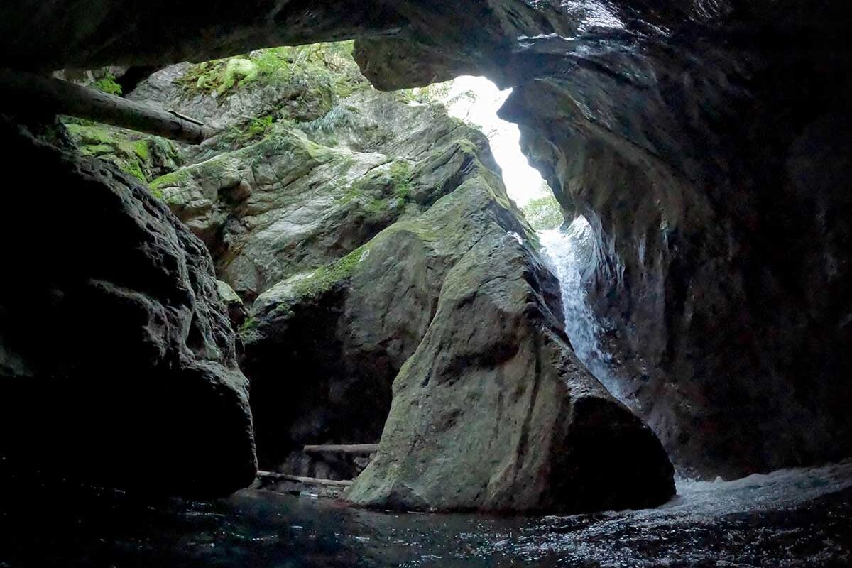 これほど複雑に侵食されたゴルジュは全国的にも珍しい。両岸がハングし、水流はその狭間を蛇行している。最奥にさらなる暗闇が目視できるが果たして突破できるのだろうか。