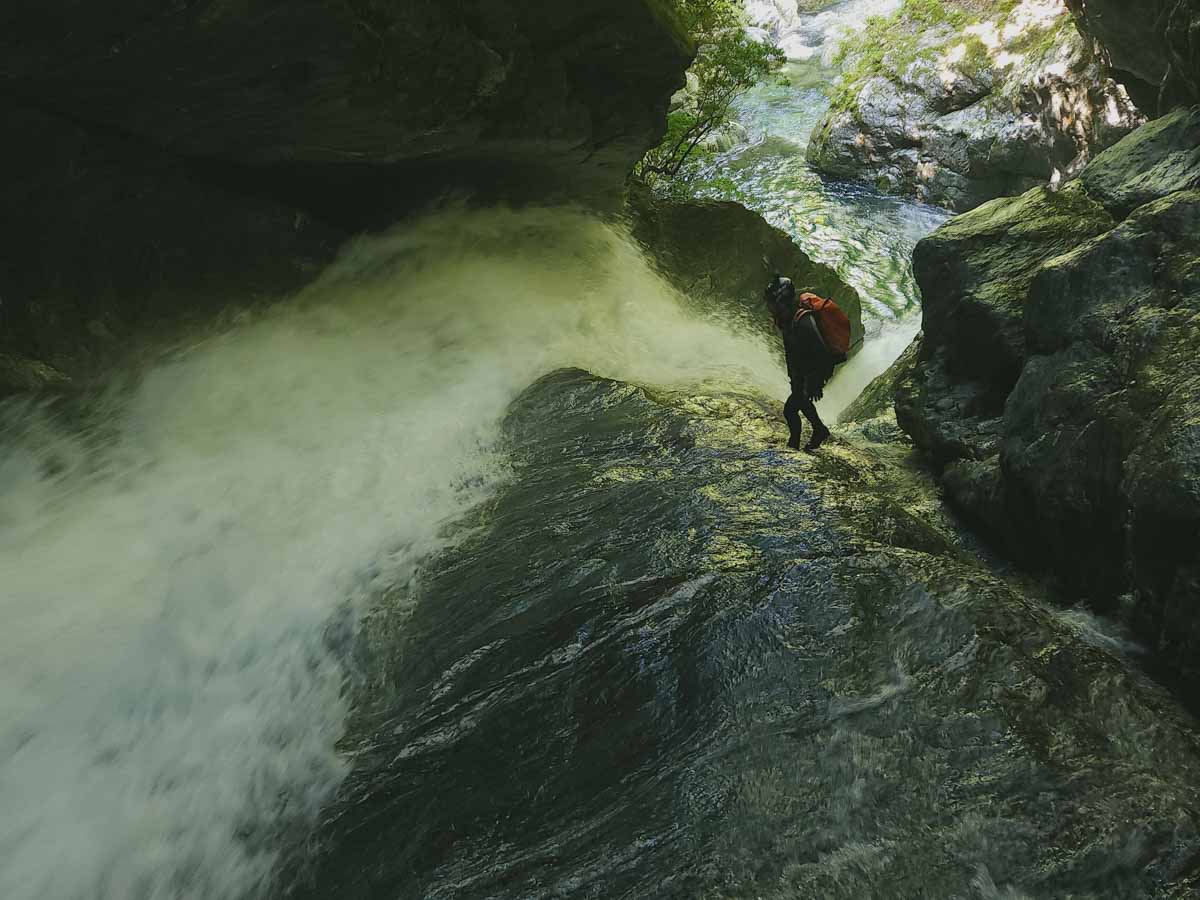 弘沢のハイライトの一つでもある、15mツイスト滝。こんな水量の弘沢は初めて見るが、今の私にはどうということはない。激流に吹き飛ばされながら対岸へ。この滝は、水流さえ越えてしまえば左壁をロープなしに登攀できる。