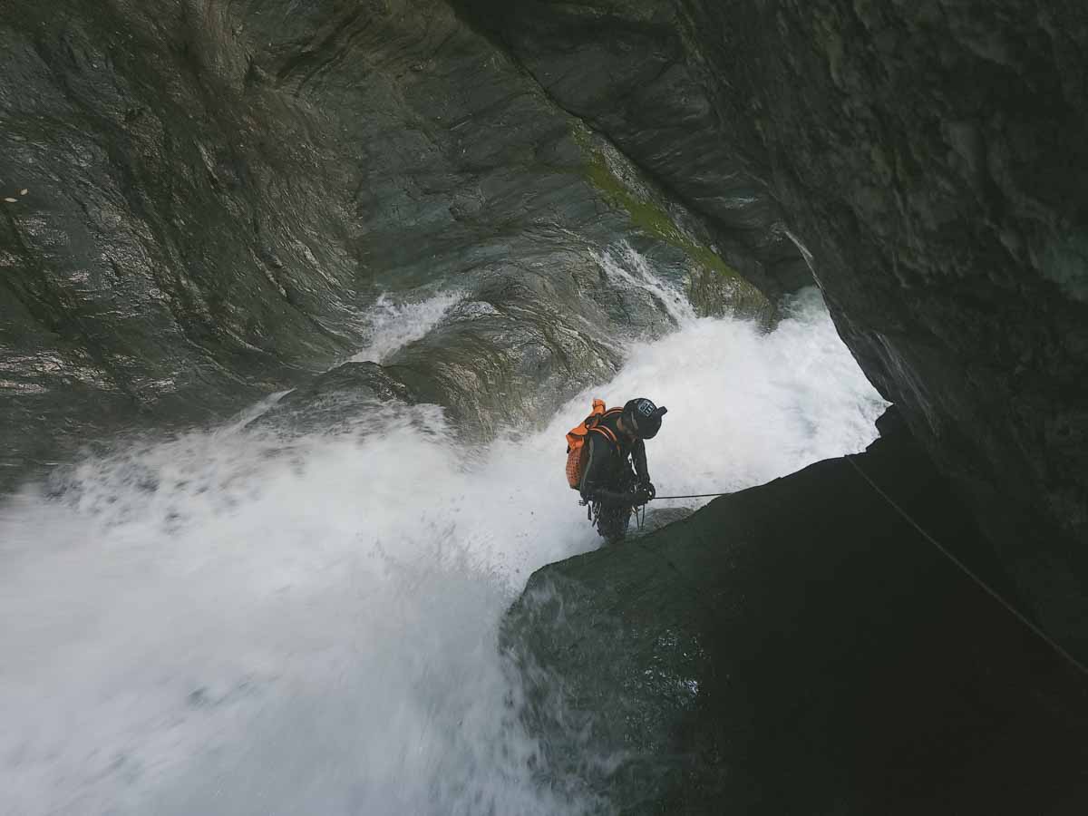 12mは左から。今日は水量が多く水際から泳いでいけず、右岸棚状から。その上で屈曲した先の空間は増水しているとなかなかの迫力だ。登攀ラインに水流は関係なく、快適に抜ける。