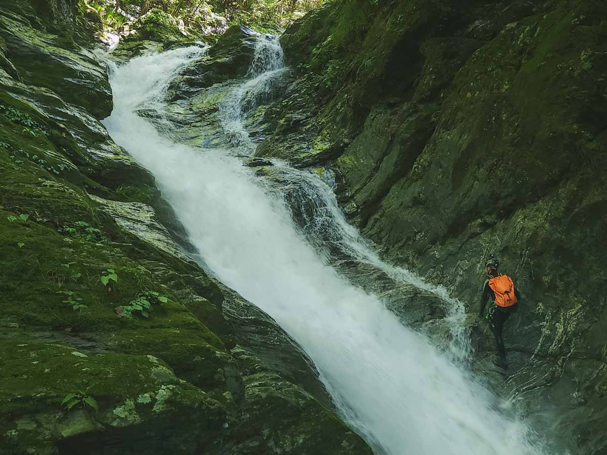 入渓してすぐに二条滝を中心から越えていく。前半セクションではバリエーションに富む滝が次々に現れる。