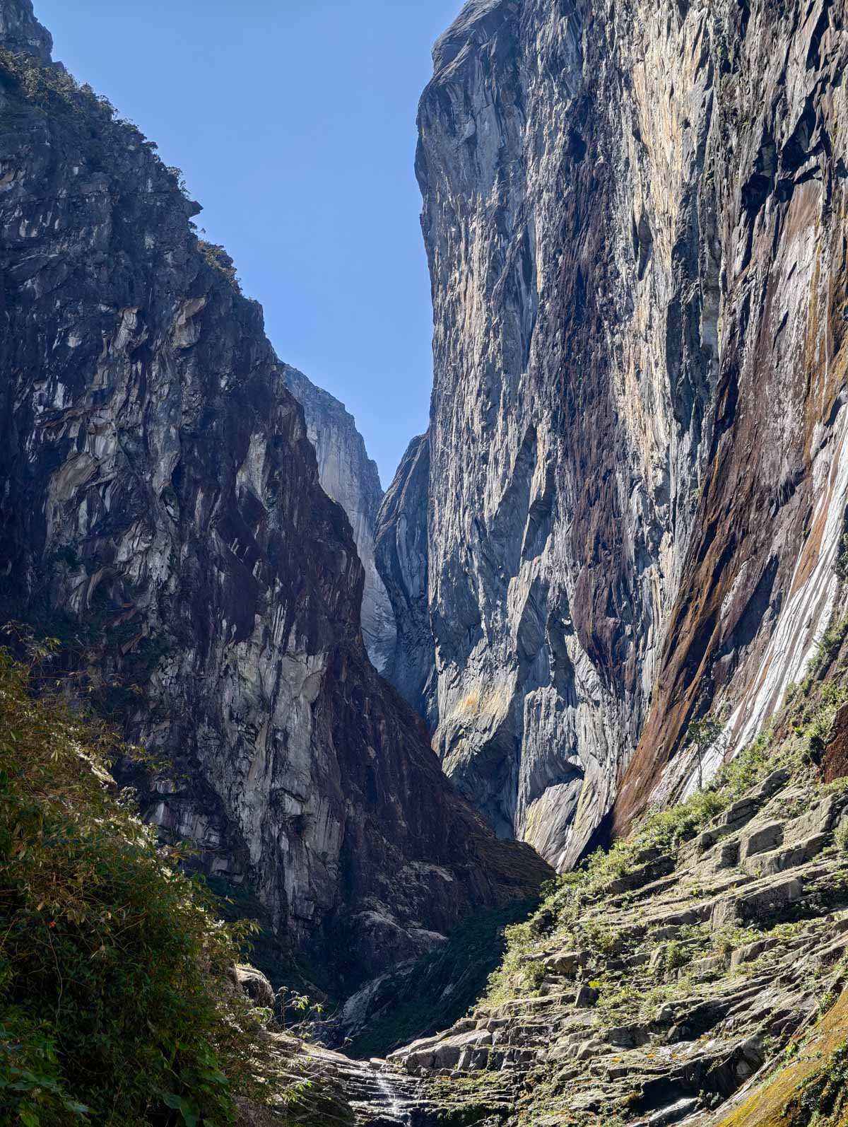 側壁は最大で約800m。白い花崗岩の岩塊が垂直に立ち上がり、その足元を深くえぐられた谷が走る。規格外という言葉では足りないスケールの空間を、私たちはキャニオニングという手段で下降してきた。