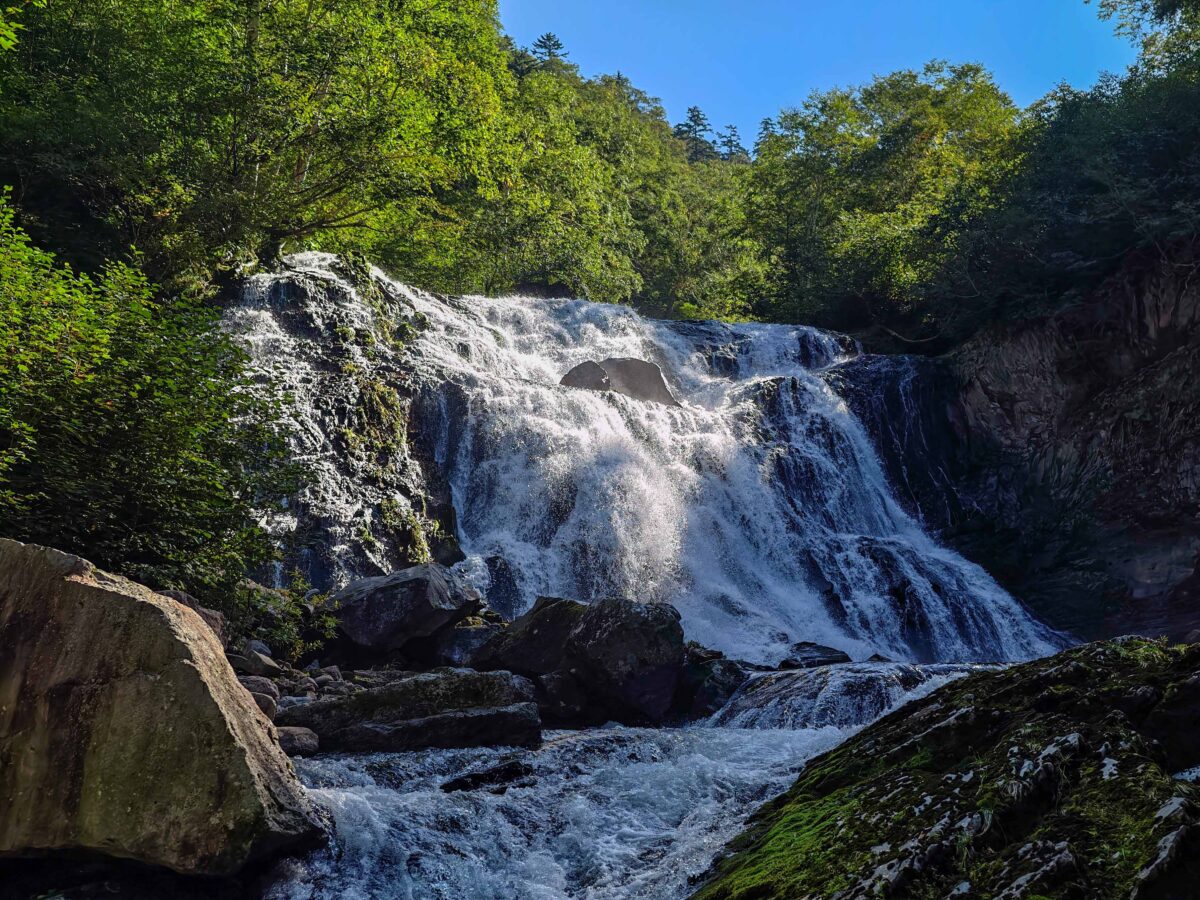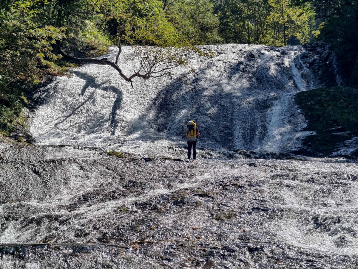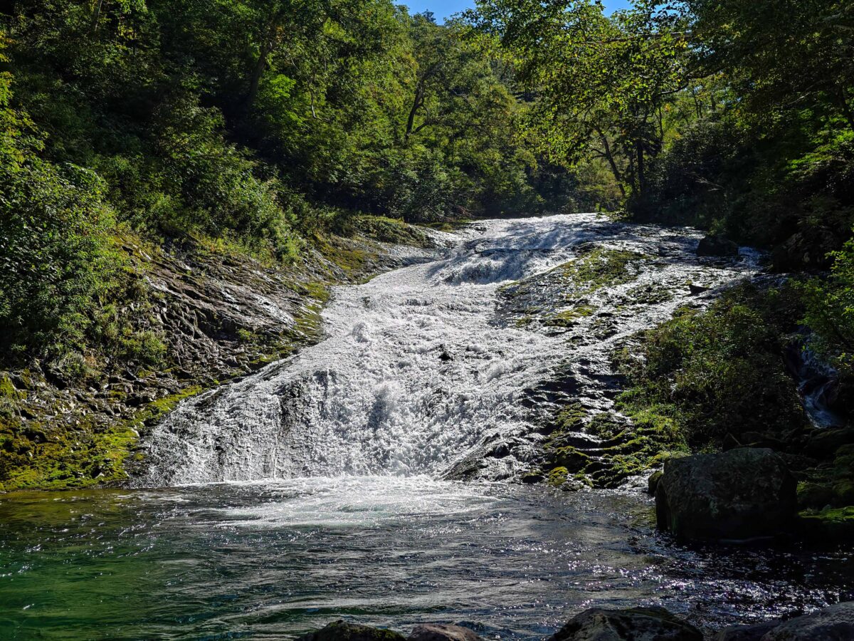幅数十メートルの滑床いっぱいに流れる水流が午前の陽を反射し、白銀に輝いている。時折現れる釜に注がれる水流は、息を呑むような極彩色を発し、また白銀の水流となって流れ出る。どこまでも続く滑床は天国への道のようだ。