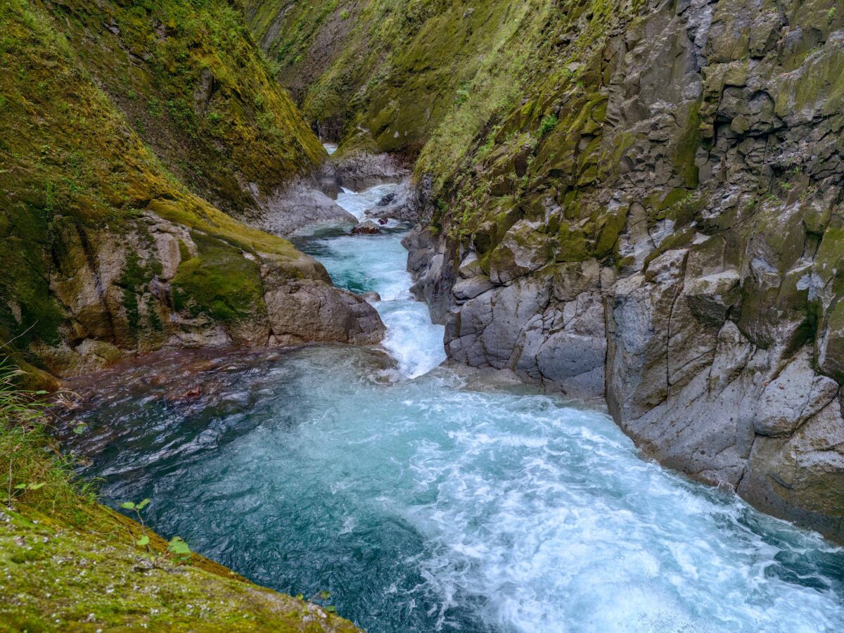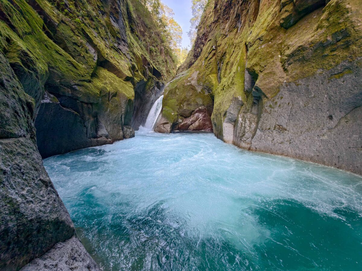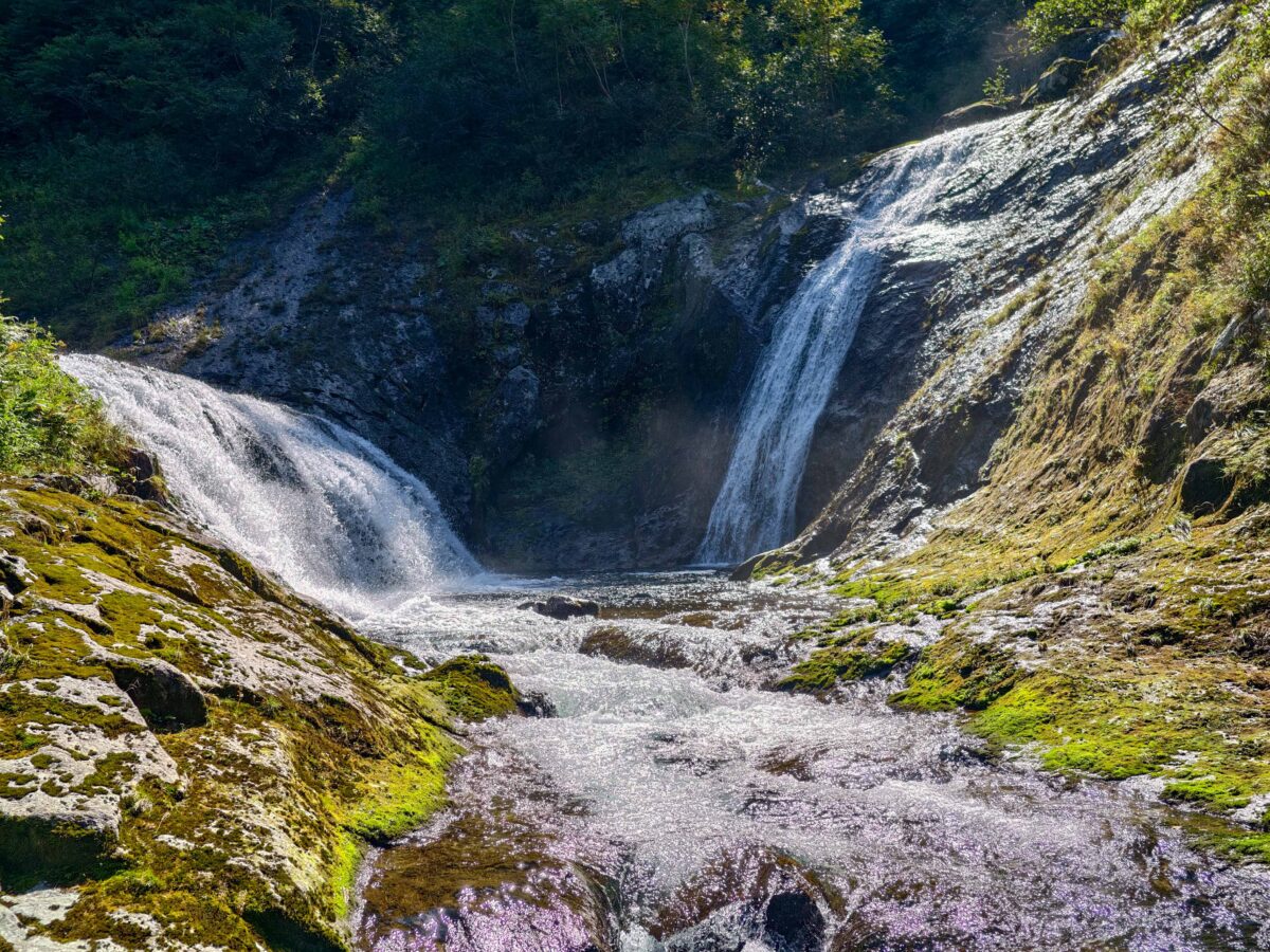 幅数十メートルの滑床いっぱいに流れる水流が午前の陽を反射し、白銀に輝いている。時折現れる釜に注がれる水流は、息を呑むような極彩色を発し、また白銀の水流となって流れ出る。どこまでも続く滑床は天国への道のようだ。