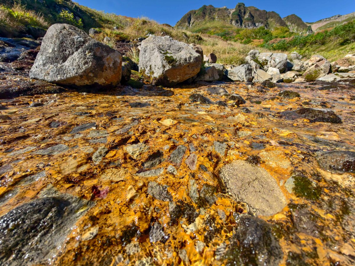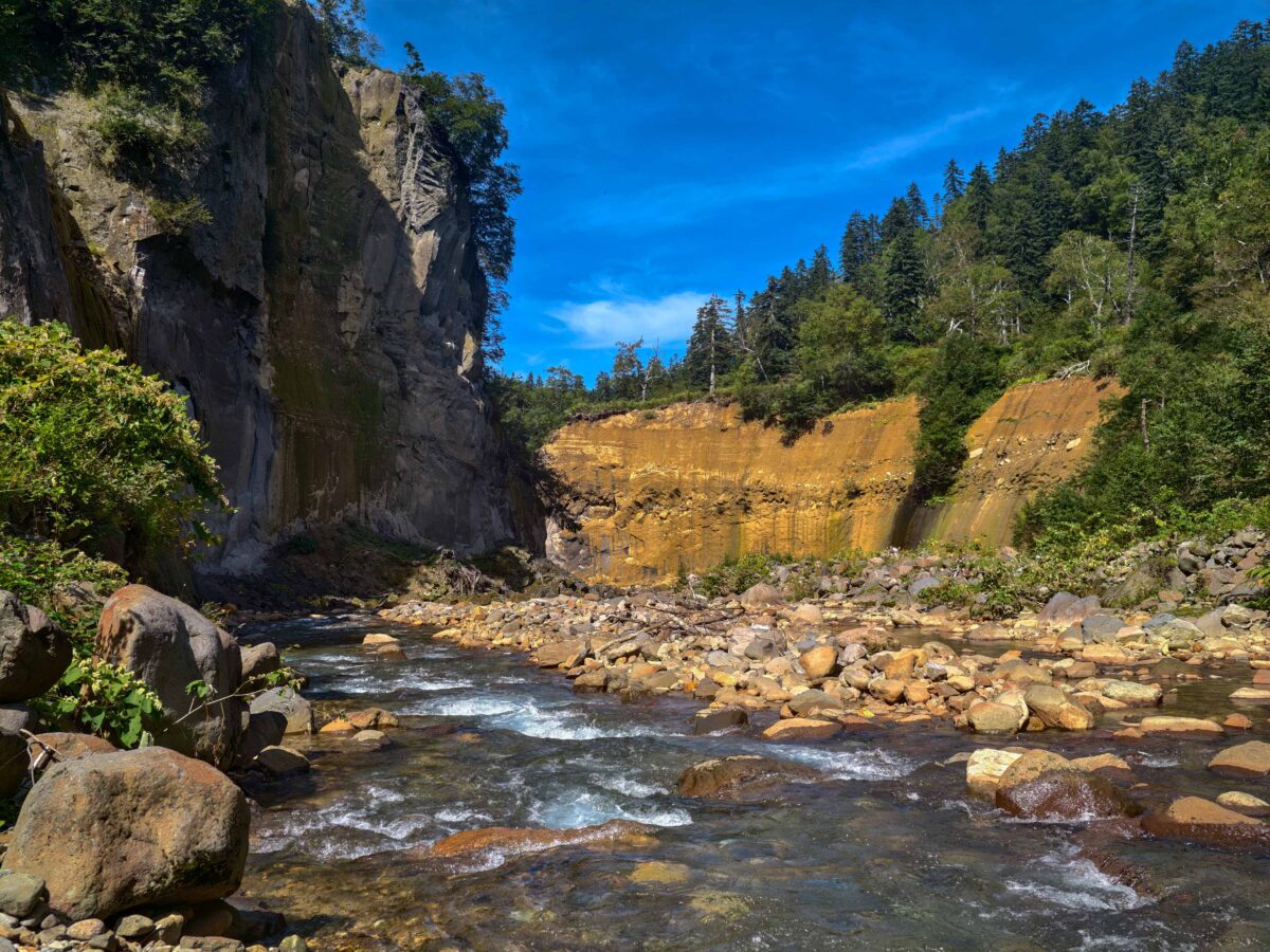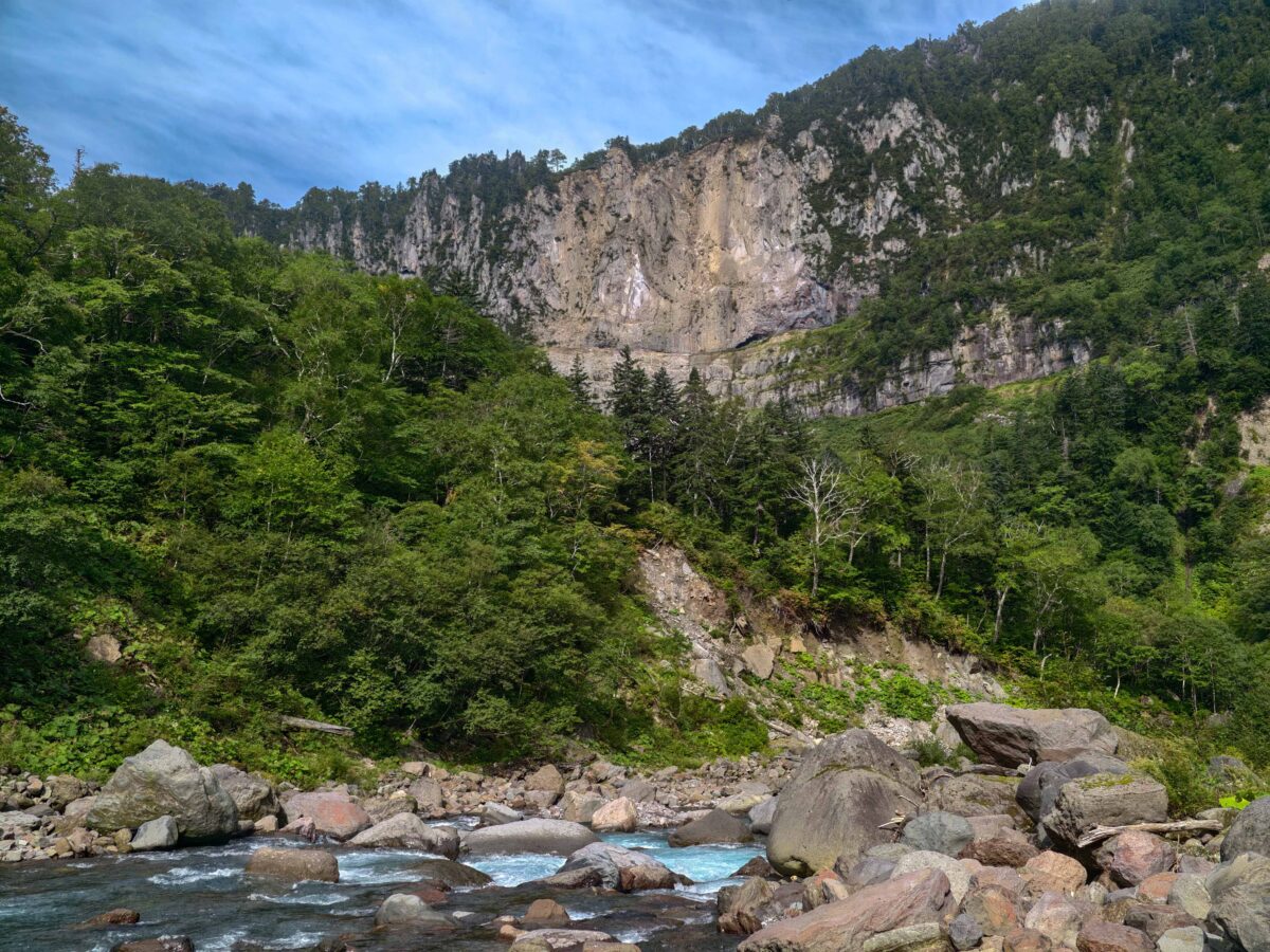 クワウンナイ川のあまりの美しさに、脳内で快楽物質が大量に分泌されて思考力が皆無になっていた私は、深く考えずにボロボロの巻道を登攀し、滑落した。