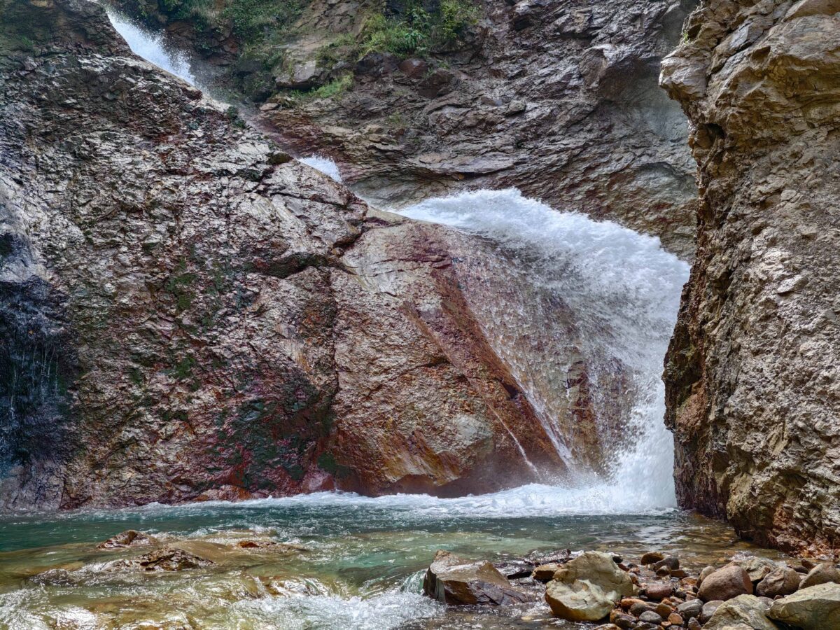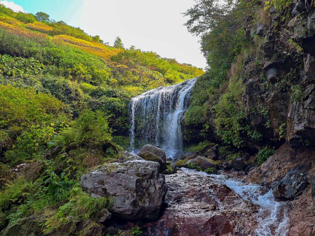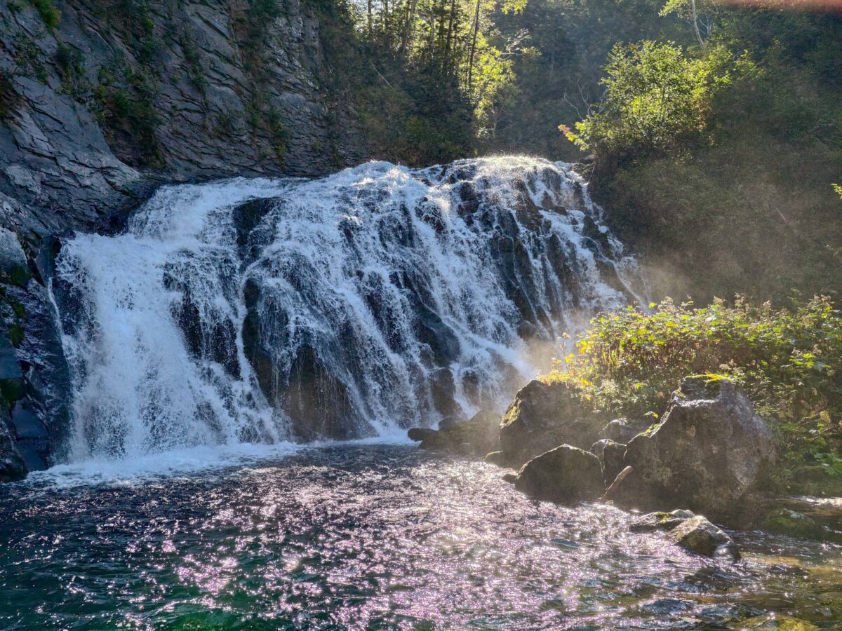 化雲沢の大水量が15mの落差から大釜に叩きつられ、そこで反射した水流により生じたミストが落口に立つ我々に降りかかる。この滝は、忠別川大ゴルジュ(融雪沢・化雲沢の分岐地点にあたるゴルジュ)で最大だ。そして、大釜には支流の35m滝も水を落としている。