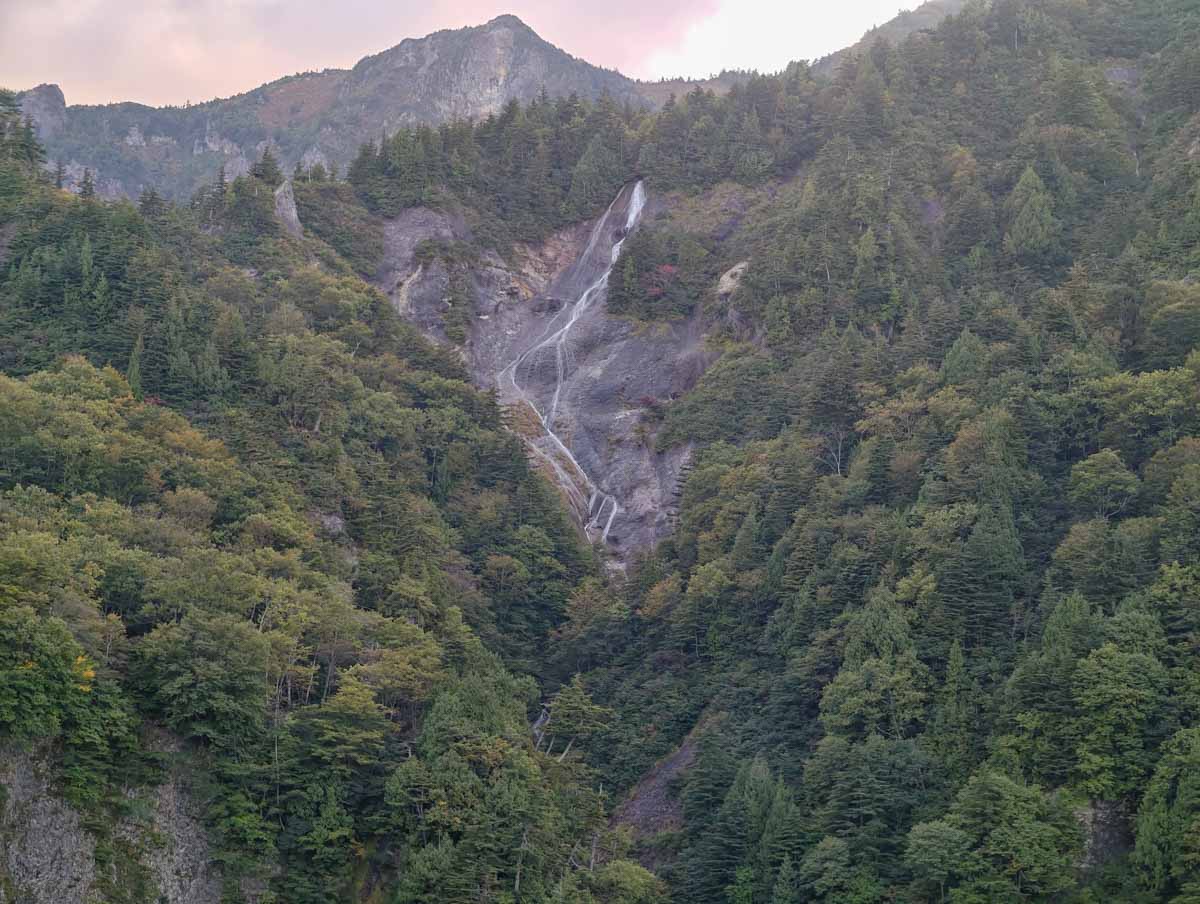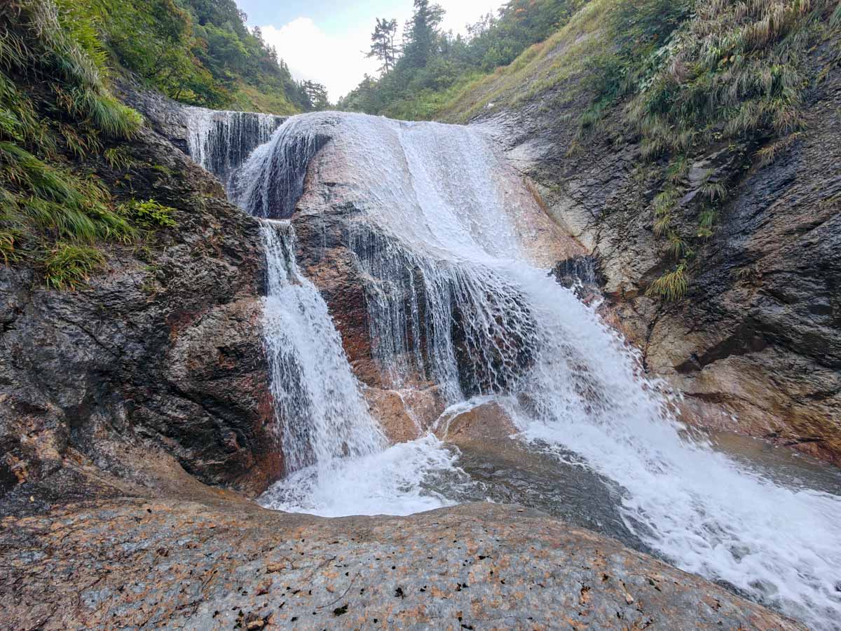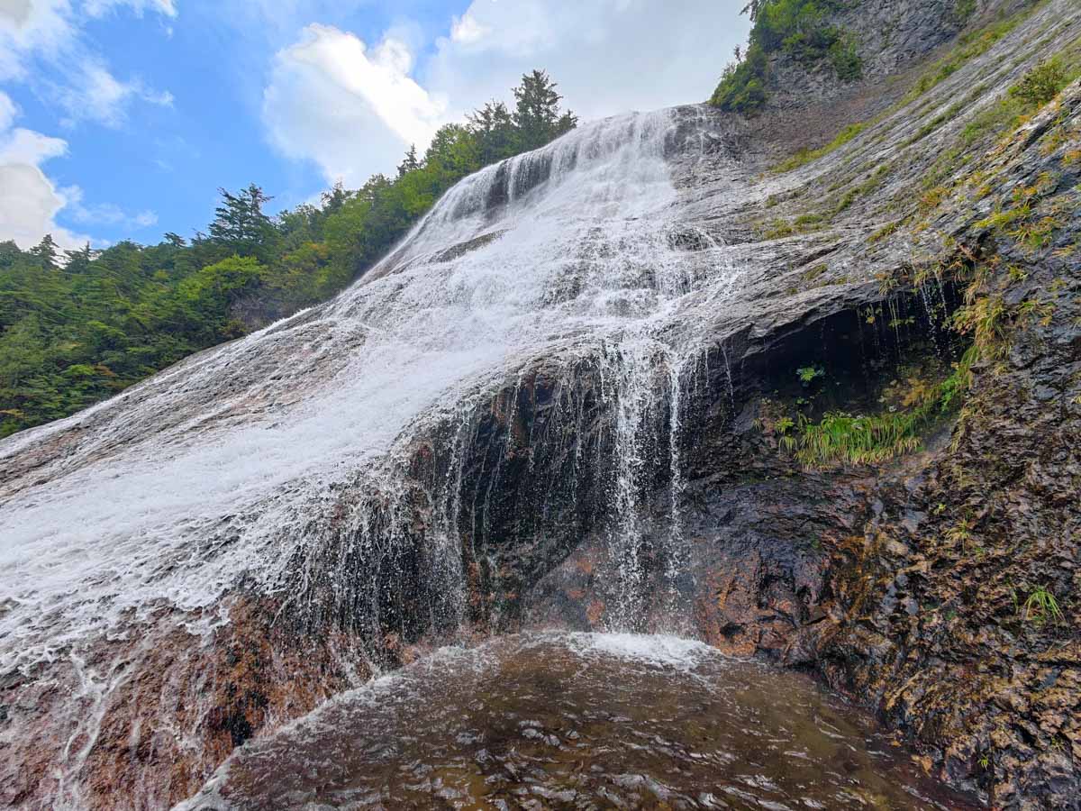 滑川大滝に訪れるのは実は二回目のことで、私が沢登りを始める前に滝愛好家として訪問したことがある。滑川大滝は落差80mの大スラブ滝だ。最下部の幅が50mはあろうかというスケールで、滑らかな岩盤を流れ落ちる水流は優雅そのもの。