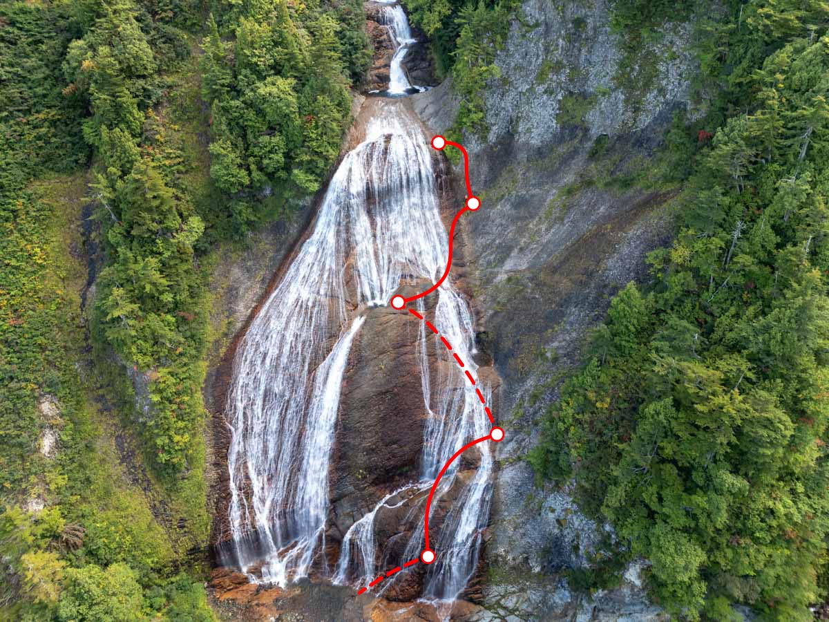 滑川大滝の登攀は左水線を行くのが正解のようだ(下山後調べたらこのラインを登攀した記録がある)。平水時ならこちらの方がスッキリと登れそうに思う。35mロープでは不自由極まりないので50mロープ以上推奨。