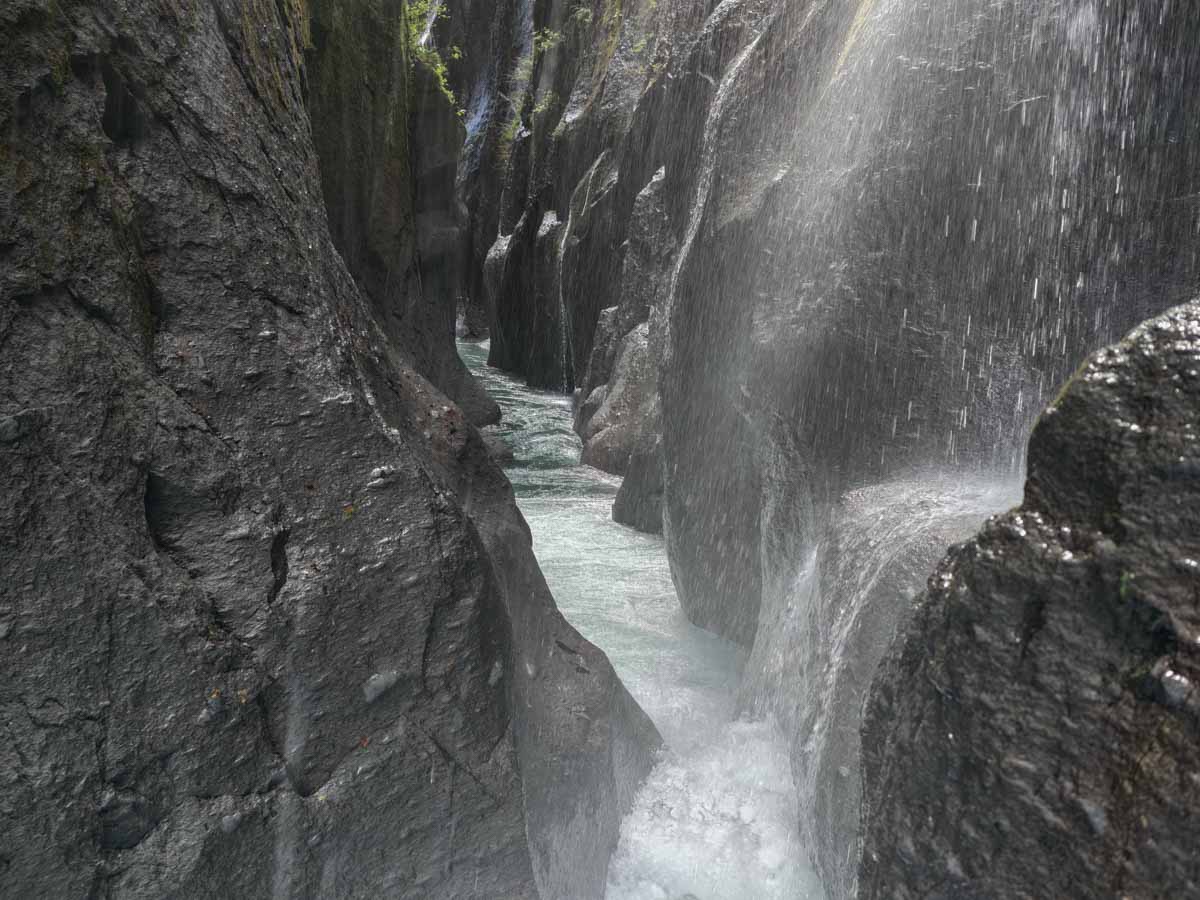 時刻は10:00。昨年、夕暮れが迫る薄暗い空間で感じたプレッシャーは、今日は、ない。ミルキーブルーの水流と、轟音を響かせる水路。有機的な侵食を見せる側壁からは幾重にも支流滝が流れ落ち、清々しささえ感じる空間だ。