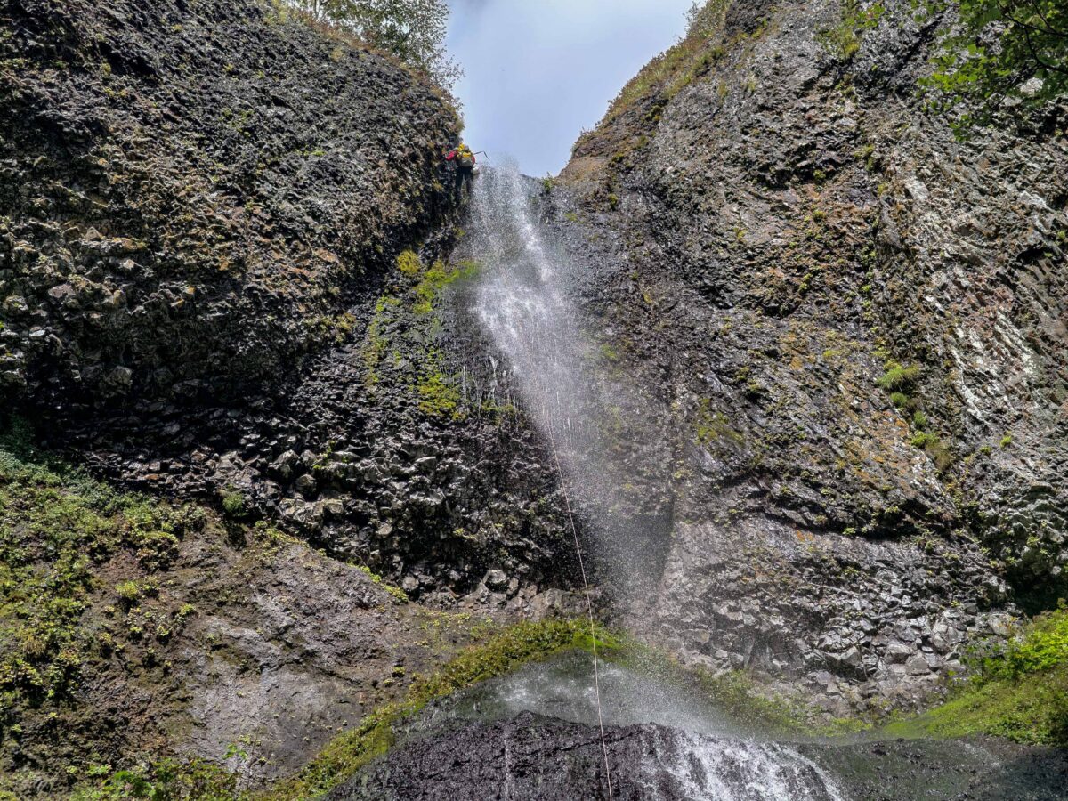 ブロックの集合体のような側壁をもつ大滝を下降すると、その先にも25m滝が。右岸側壁はよく見ればピナクルのように独立したもので、個性的だ。その先の、人間一人がやっと通れるくらいのゴルジュを抜けると急勾配のゴーロとなり、堰堤となった。