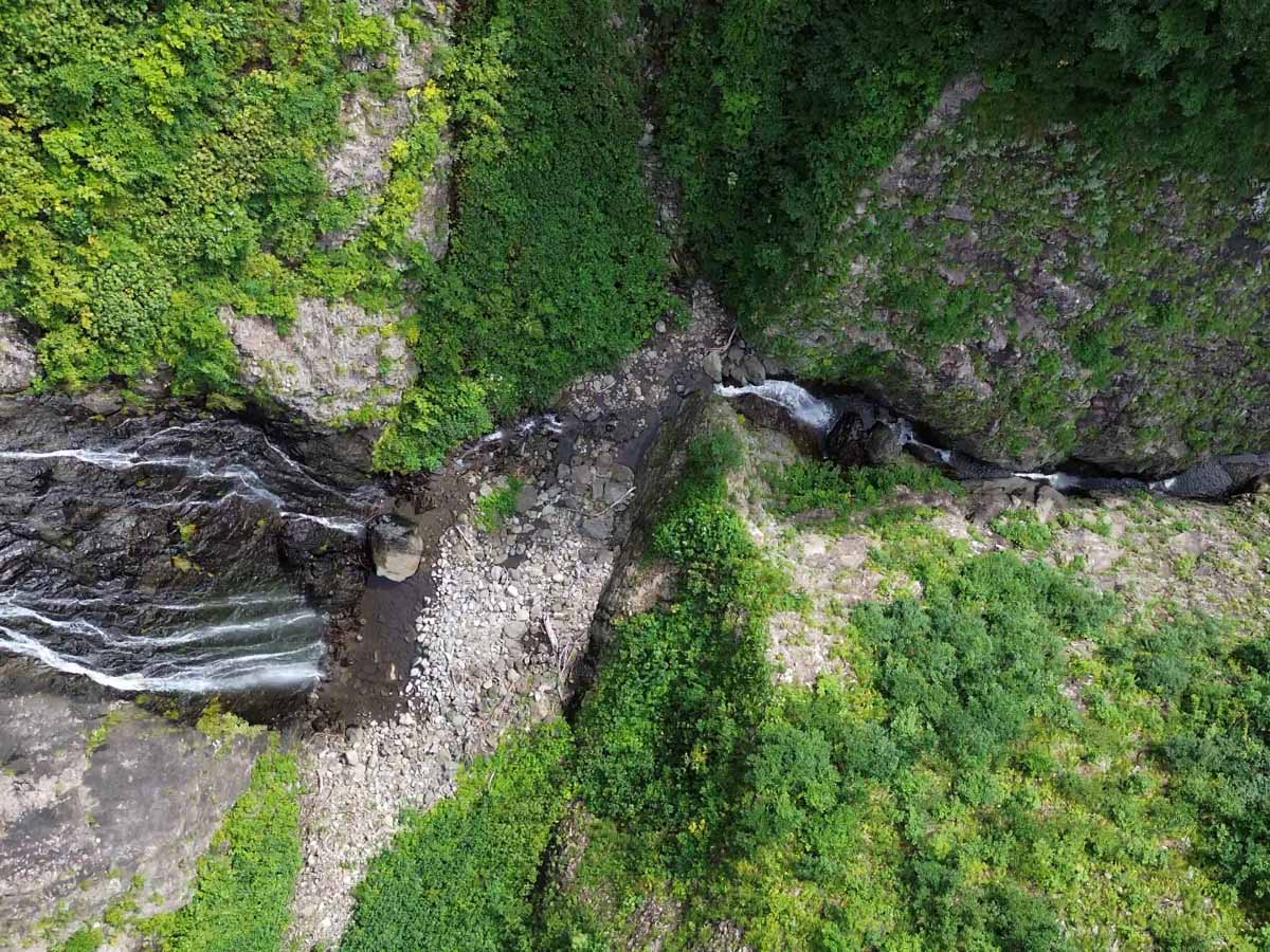 一泊二日想定で入渓していることもあり、昼までに下降を終え、本流の核心部を遡行してしまいたいところだ。しかし、最近ドローンを買った大西が、見栄えの良いセクションに差し掛かるたびドローンを飛ばし、なかなかペースが上がらない。まあ、どうせバッテリーすぐ切れるでしょ、と思っていたら、なんとオプションの大容量バッテリーを三つも持ってきているではないか。