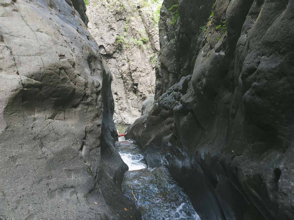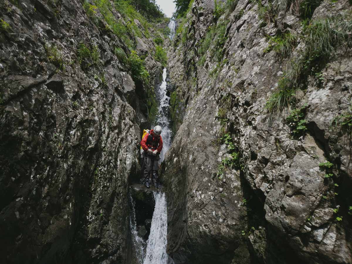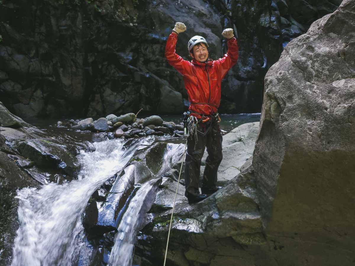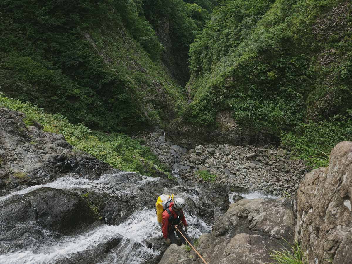 大滝を下降し、ゴルジュに入って行く。ゴルジュ内は幅1mほどまで細くなり、10mほどのCS滝を連続させる。登攀では相当難しい地形をしており、おそらくここに足を踏み入れるのは我々が最初だろう。ときに30m近くある大滝が現れるなど、ゴルジュの内容は非常に濃いものだった。