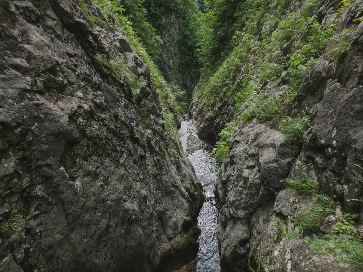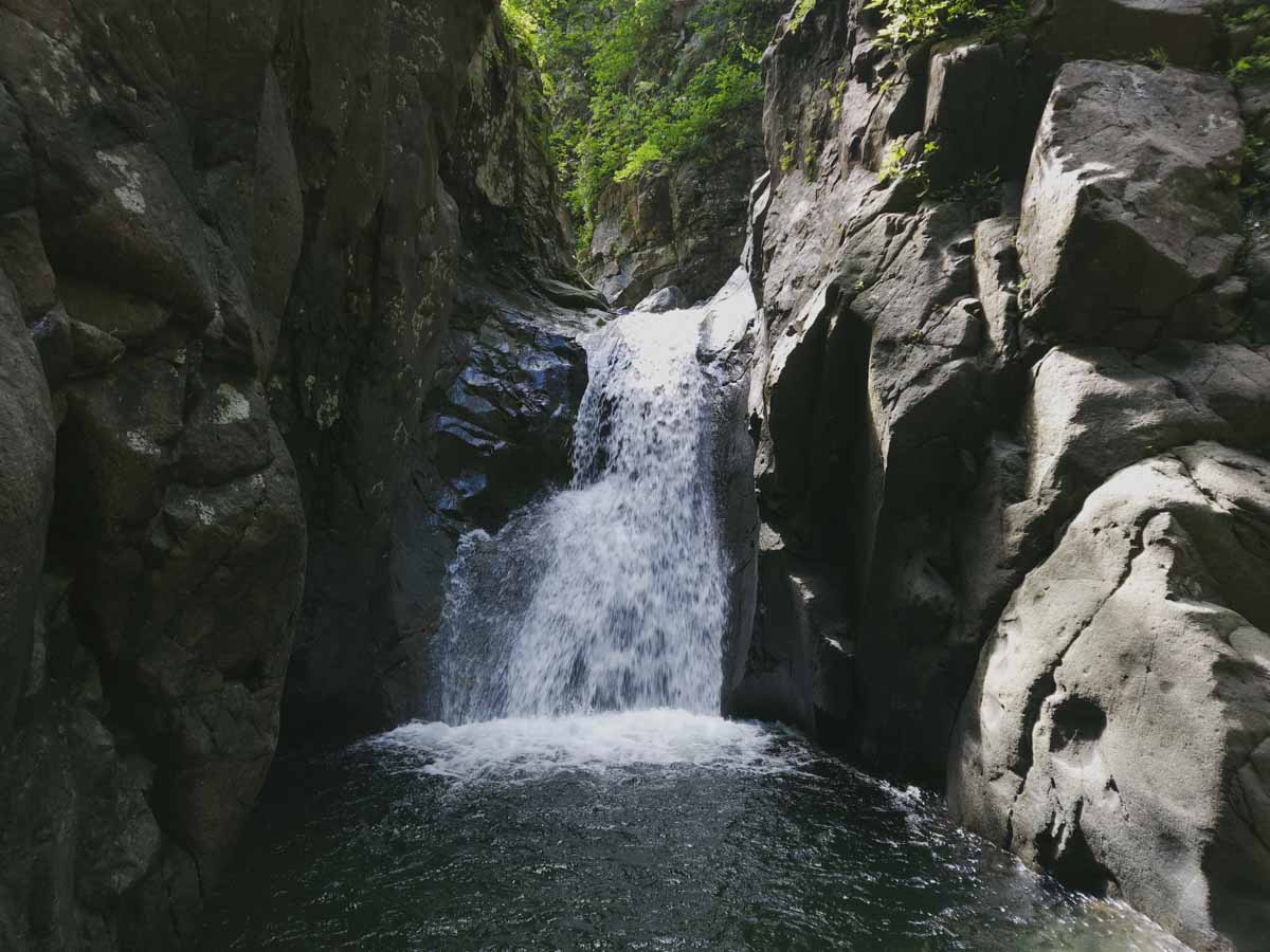 ハイライトはゴルジュ最深部の3m滝。普段なら水流近くの水平クラックをエイドで登ってしまうところだが、なんだかボルダーのように登ることもできそうだ。