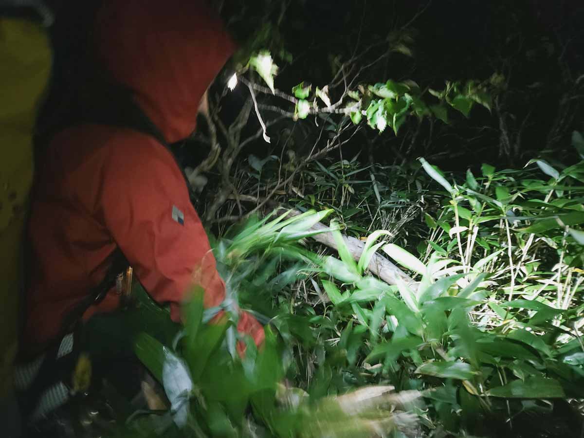 日没直前。まだ源頭の藪漕ぎが残っているが、食料の残量からしてなんとしても今日中に下山しなければならない。大西いわく”小楊枝川を越える最強クラスの藪漕ぎ”をこなし、ヘッドライトで下山した。